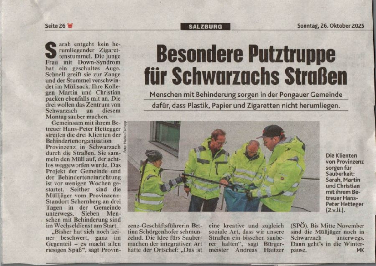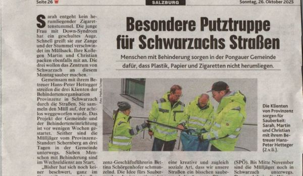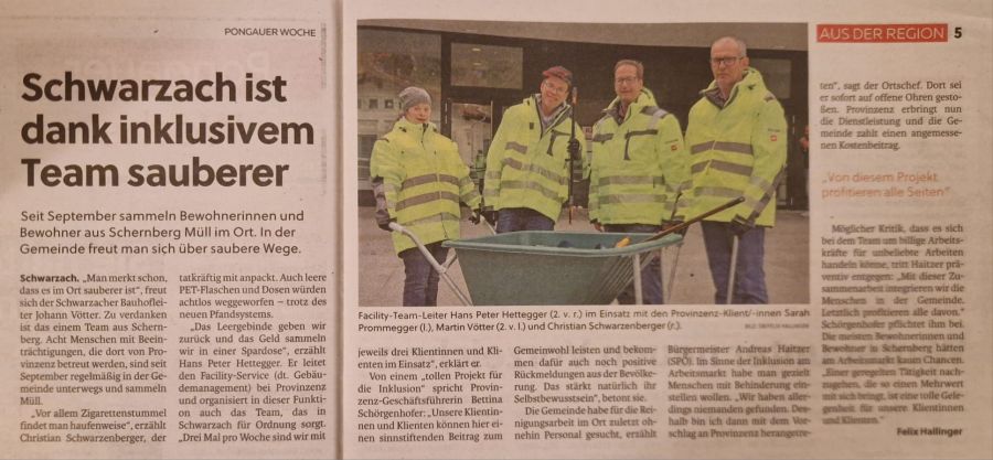 Die Initiative ist Teil einer gemeinsamen Aktion von Provinzenz und der Gemeinde Schwarzach, bei der sieben Menschen mit Behinderung im Wechseldienst an mehreren Tagen pro Woche aktiv sind. Unterstützt werden sie dabei von ihrem Betreuer Hans-Peter Hettegger, der das Projekt begleitet und koordiniert.