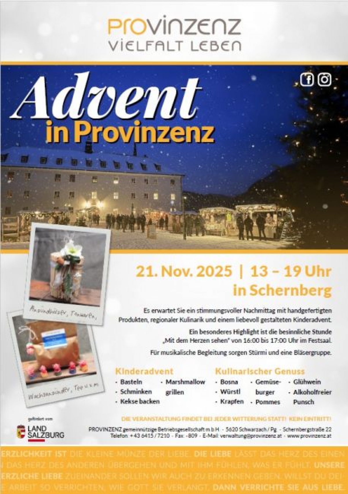 Zwischen Lichtern, Düften und Musik erwartet die Besucher:innen ein vielfältiges Programm mit handgefertigten Produkten, regionalen Schmankerln und einem liebevoll gestalteten Kinderadvent.