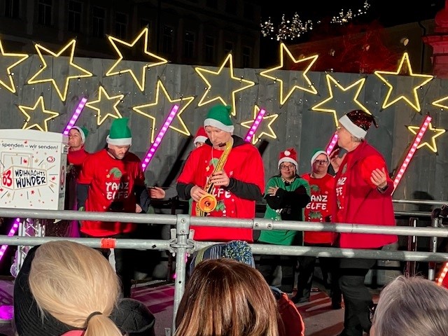 Unser Mike aus Liefering trat mit der Special Olympics Tanzgruppe Salzburg beim Ö3- Weihnachtswunder auf dem Kapitelplatz auf. Mike spielte dabei symbolisch ein Saxophon-Solo und legte damit einen ganz besonderen Auftritt hin! Die Tanzgruppe, perfekt vorbereitet vom Trainerteam der Special Olympics Salzburg, begeisterte das Publikum vor dem gläsernen Ö3 Studio. Ein ganz besonderer Moment: Philip Hansa, Moderator von Ö3 und langjähriger Botschafter der Special Olympics, empfing das Team mit offenen Armen, tanzte mit und bejubelte ihre Performance! Jeden Montag fährt das Team von Provinzenz Liefering mit Klient:innen zu den Tanztrainings der Special Olympics. Der Auftritt beim Ö3-Weihnachtswunder war sicher einer der größten und aufregendsten – ein unvergesslicher Meilenstein auf ihrer Reise!