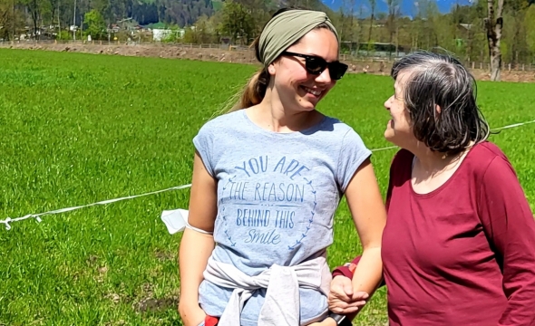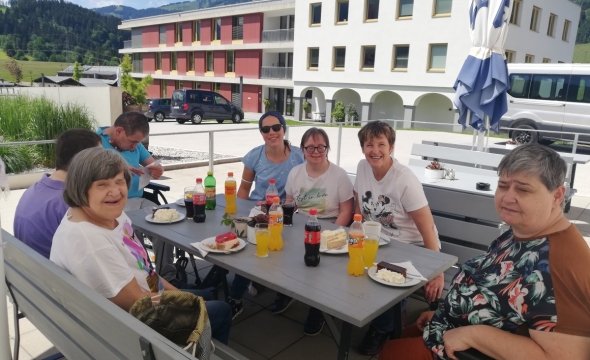 Die Klient*innen von Provinzenz Mitterberghütten stimmen sich bei dem schönen Wetter auf den Sommer ein.