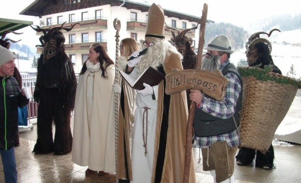 Am 6. Dezember machten Nikolaus, Engerl, Körberlträger und zahlreiche Krampusse der Höllenpass Schwarzach die diesjährige Nikolausfeier zu etwas ganz Besonderem. Eindrucksvoll zeigte sich das Bild vom Nikolaus mit seinem Gefolge, als sie sich dem Haus näherten.