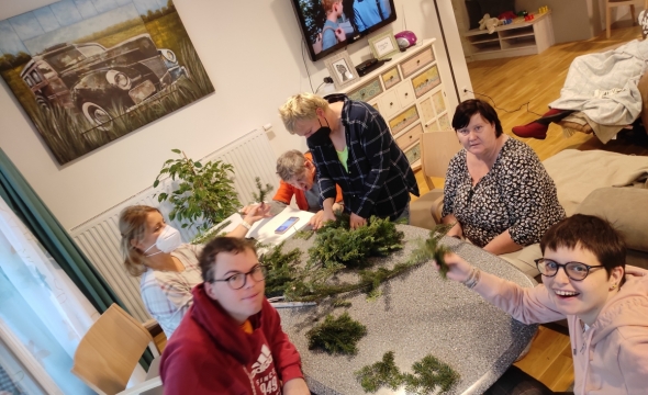Die Klient*innen von Provinzenz Schwarzach Markt bereiten für die kommende Adventszeit einen schönen Adventskranz vor.