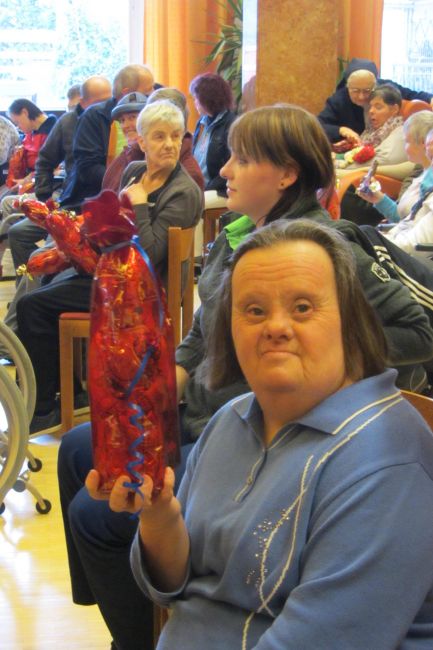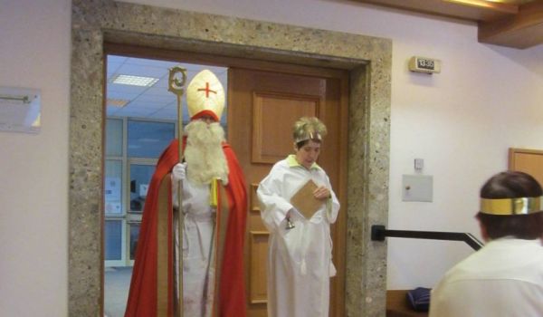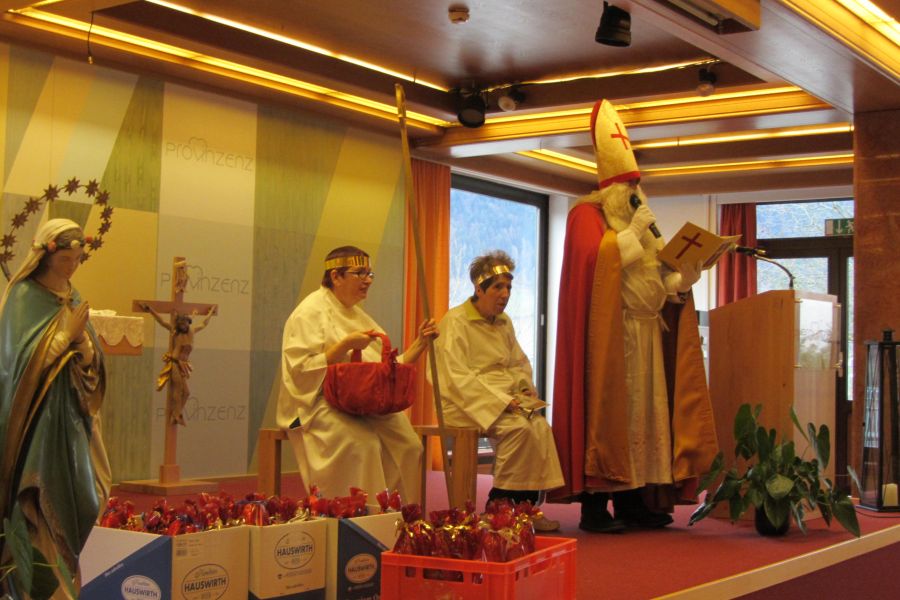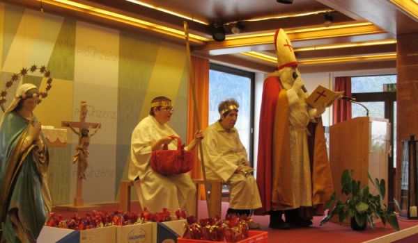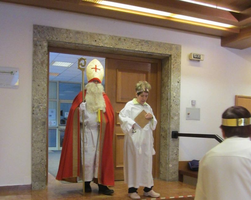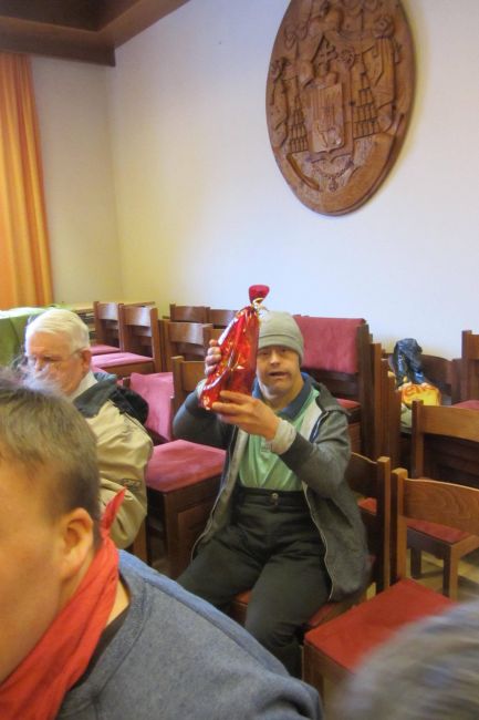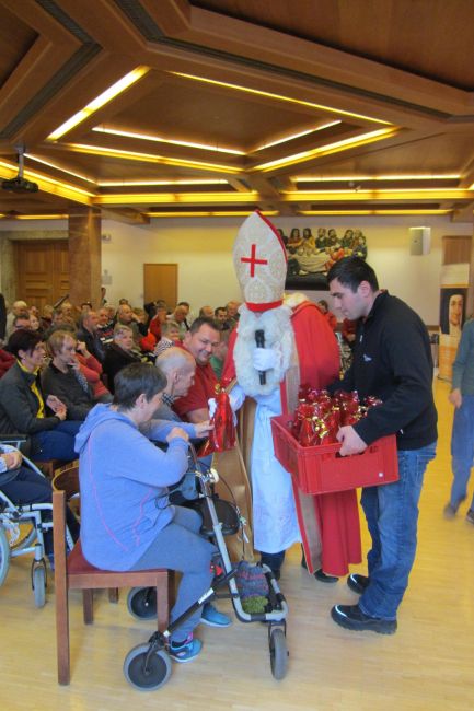 Umso größer war schließlich die Freude, als der schön gekleidete Nikolaus mit seinem weißen Bart und der Bischofsmütze den Festsaal betrat. Gefolgt von zwei zauberhaften Engeln, welche ihn stolz begleiteten. Nach einer feierlichen Ansprache und einem Gedicht, durfte das gemeinsame Lied „Lasst uns froh und munter sein und uns recht von Herzen freun,…“ selbstverständlich nicht fehlen. Die mitgebrachten Körbe waren reich gefüllt und alle Anwesenden konnten sich über ein Nikolaussackerl freuen. Dieses bekam jeder vom Nikolaus persönlich mit ein paar netten Worten und Grüßen überreicht. Bei Leberkässemmel und Getränken klang der Nachmittag gemütlich aus.