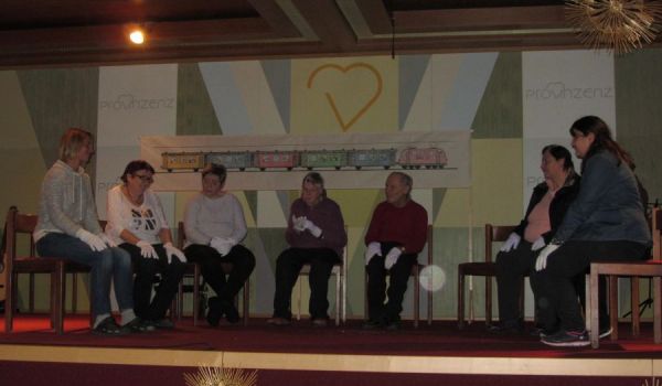 Markus Pirnbacher organisierte die Feier und führte als Moderator durch das Programm. Der geschmückte Festsaal bot genügend Platz für die Besucherinnen und Besucher und stellte einen angemessenen Rahmen dar. Die „Schlossleitn Musi“ sorgte mit Zither- und Gitarrenklängen für Besinnung und umrahmte die Weihnachtswünsche von Geschäftsführung und Sr. Renate sowie ein stimmungsvolles Gedicht. Pater Herbert brachte die Anwesenden mit seiner Weihnachtsgeschichte vom kleinen Simon, der mit seinem Vater am Hl. Abend im Railjet nach Rom unterwegs war zum Nachdenken und erntete für die ganz besondere Darstellung regen Applaus. Die Kinder der Volksschule Schwarzach gaben in ihrer Darbietung einen musikalischen Einblick, wie Weihnachten rund um den Globus gefeiert wird. Ihre weihnachtliche Weltreise wurde mit großem Interesse verfolgt und bei so manchem wohl bekannten Lied wurde eifrig mitgesungen. Ein besonderes Highlight war die Interpretation des Liedes „Leise rieselt der Schnee“ der Gruppe Erle. Hier ließ die Kombination von Gesang, Gebärden und visueller Darstellung, das oft gehörte Lied noch einmal völlig neu erleben und wahrnehmen. Äußerst eindrucksvoll war auch die Darbietung der Aktivierungsgruppe. Fluoreszierende Handschuhe zauberten dabei eine beeindruckende Stimmung auf die Bühne. Der Jahresrückblick rundete das gelungene Programm ab und zu guter Letzt konnten sich noch alle Besucherinnen und Besucher über einen selbstgebackenen und wohlschmeckenden Lebkuchen freuen.