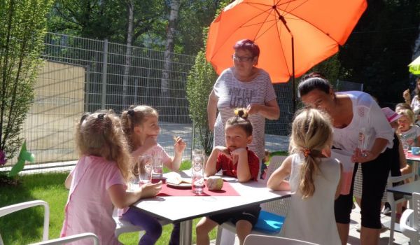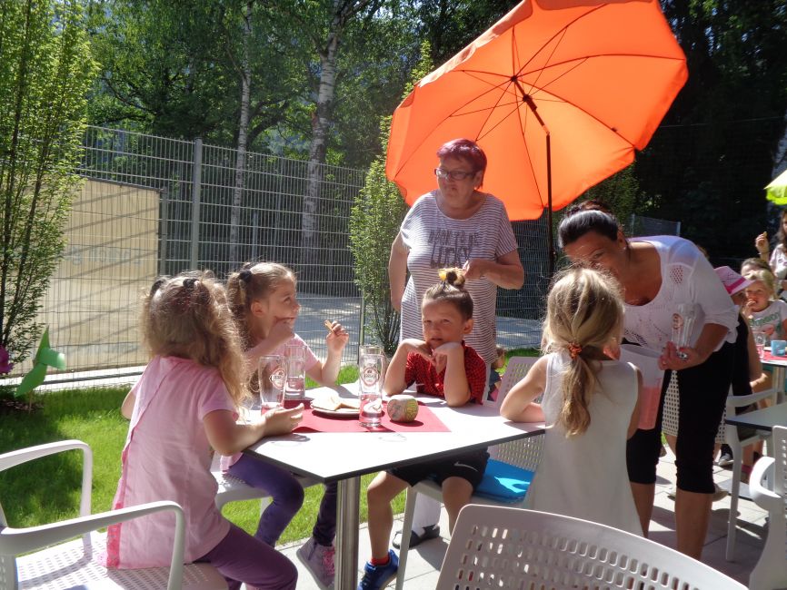 Die 24 Kinder und deren vier Betreuerinnen waren sehr aufgeschlossen, wissbegierig und neugierig gegenüber der neuen Umgebung und freuten sich auf das Kennenlernen von unseren Klientinnen und Klienten. Anfängliche Zurückhaltung war spätestens bei der gemeinsamen Jause vergessen. Es wurde ein herrlicher Obstsalat und Kekse serviert.