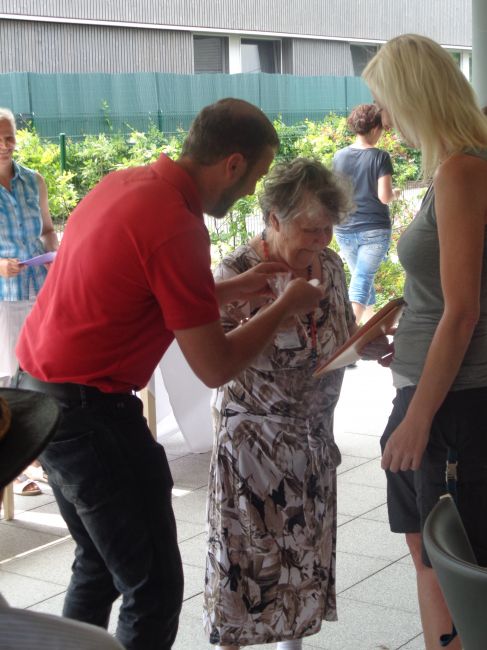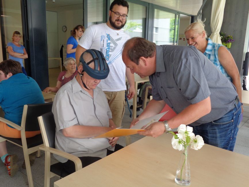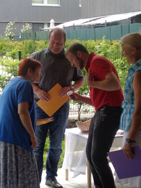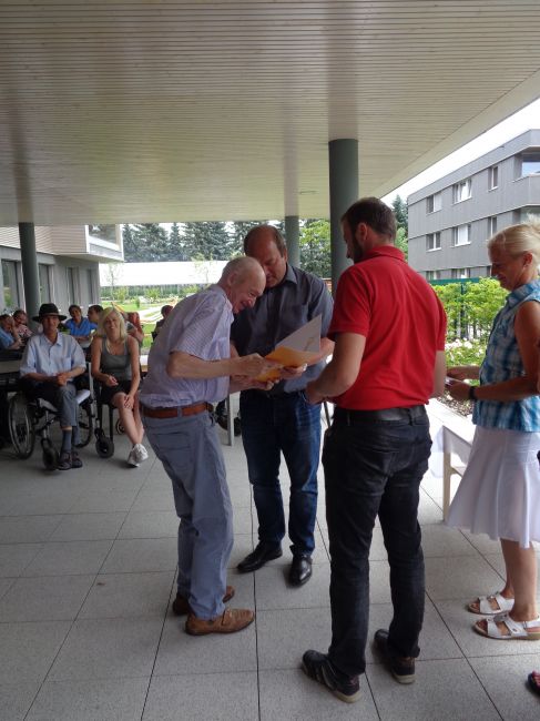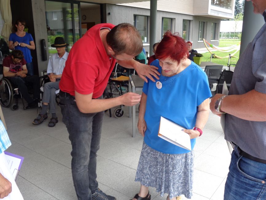 Als Zeichen des Dankes und der Anerkennung wurden vom Geschäftsführer Jürgen Rettensteiner und den Leitungen des Hauses eine Urkunde, eine Medaille und ein persönlich gestalteter Button zum Anstecken als Geschenk überreicht. Die Klientinnen und Klienten blicken auf eine bewegende und erfüllende Zeit in Provinzenz zurück. Dies wurde an einer gestalteten Pinnwand mit Fotos der Jubilare zum Ausdruck gebracht. Für die musikalische Umrahmung der Ehrung sorgten die Sänger der Gruppe „Abba“.