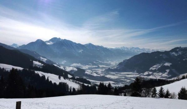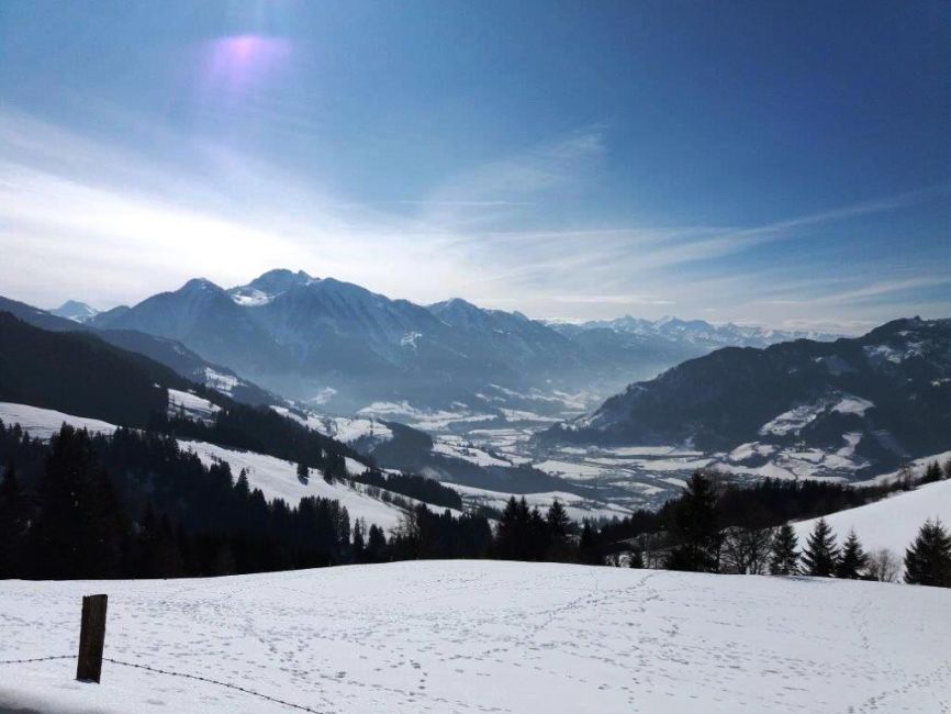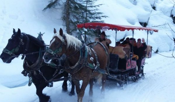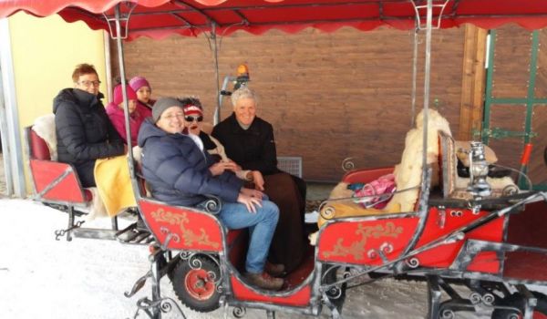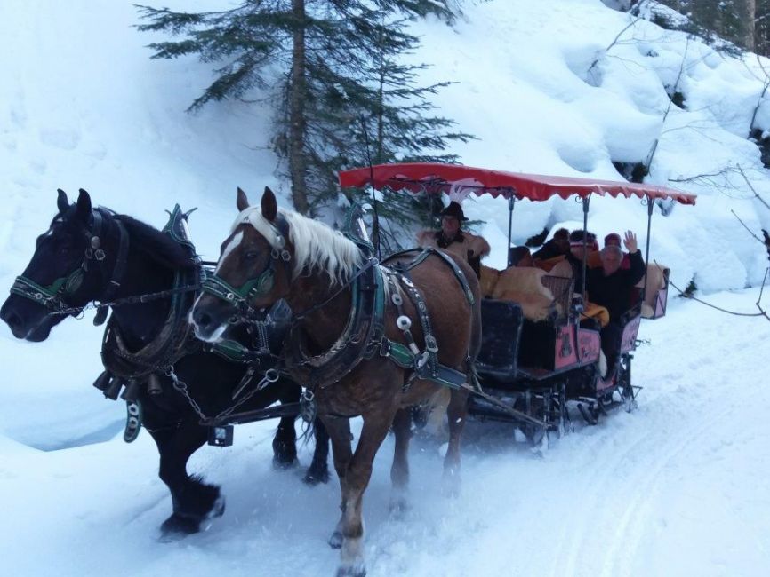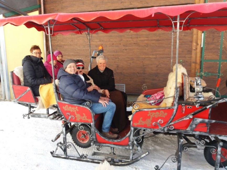 Die Klientinnen und Klienten vom Haus Königsegg nutzten das traumhafte Wetter hoch über St. Johann im Pongau für eine idyllische Pferdeschlittenfahrt durch die verschneite Winterlandschaft.