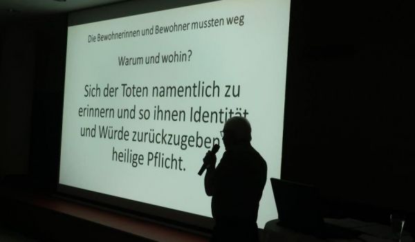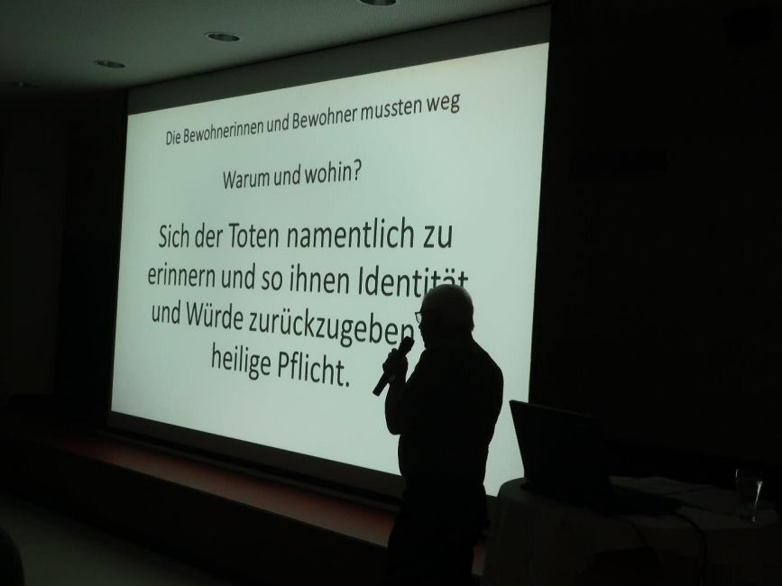 Anschließend informierte Herr Dr. Josef Neumaier in einer Präsentation im Provinzenz Schernberg über die 123-Euthanasie-Opfer, die in Hartheim vergast wurden und den Widerstand der Barmherzigen Schwestern. Nach einer eingehenden Diskussion wurde dann die „Friedensoase“ besucht und beim Mahnmal der Opfer gedacht.