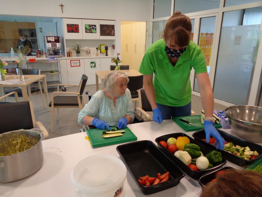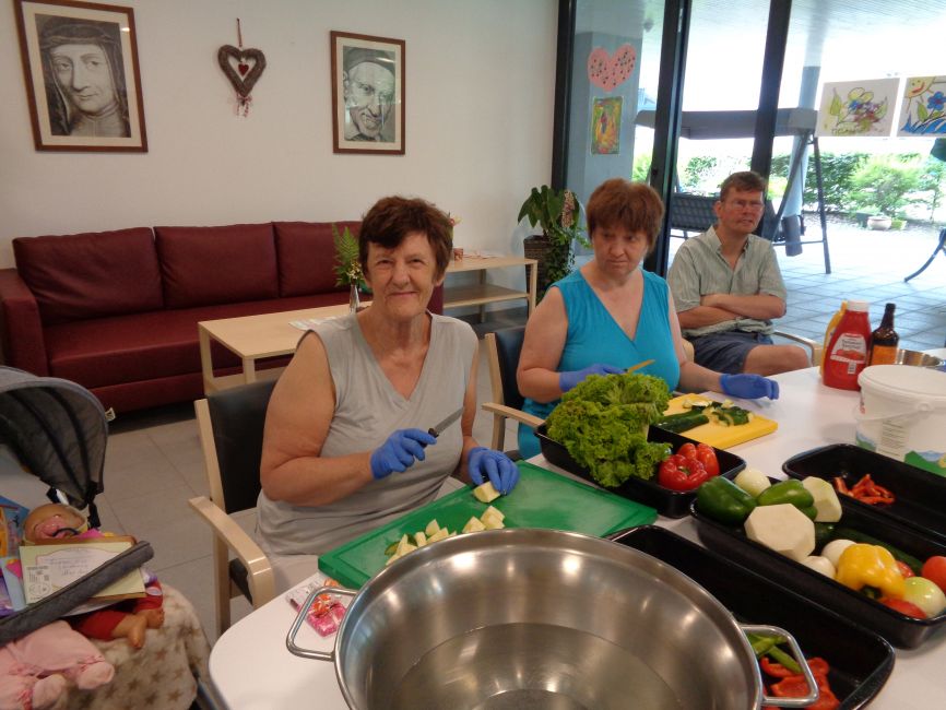 Bei den Vorbereitungen war einiges zu tun. Gemüse wurde gemeinsam geschnitten, gewaschen und zubereitet bzw. anschließend in die entsprechenden Schalen gegeben. Sogar Kräuter wurden gesammelt und getrocknet und schlussendlich ließ man es sich auf der gemütlichen Terrasse richtig gut gehen. Nach den geleisteten Vorarbeiten zum Grillnachmittag wurden die vom Küchenteam zubereiteten Speisen sehr genossen und so wurden miteinander unterhaltsame Stunden gefeiert.