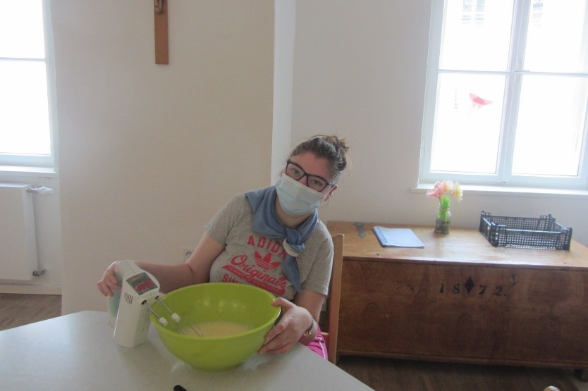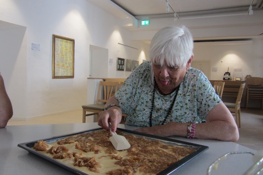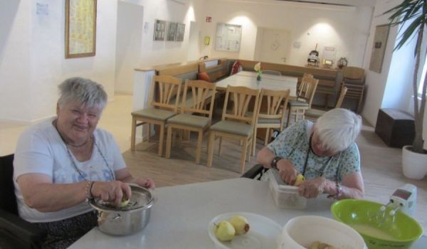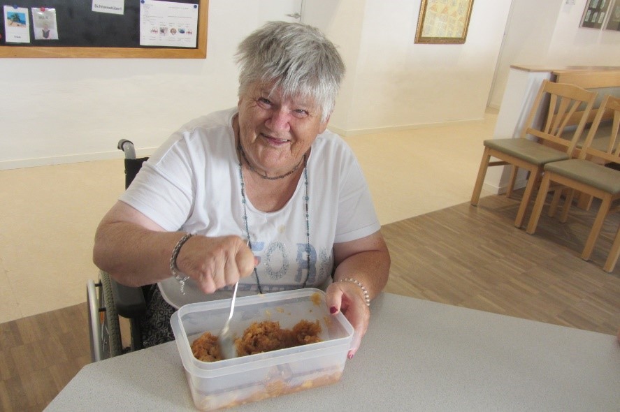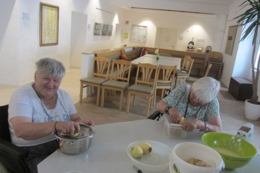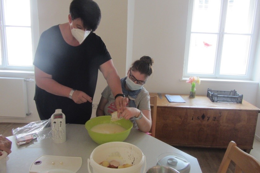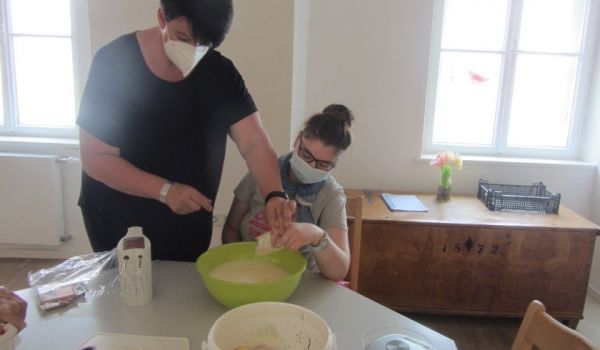 Die Klient*innen backten gemeinsam mit den Betreuer*innen einen leckeren Apfelkuchen und freuten sich darüber, dabei kräftig mitwirken zu dürfen. Während der Kuchen im Ofen war, konnten die Klient*innen die Zeit im Schlosshof verbringen und die lange Wartezeit unter anderem mit Dreiradfahren und Plaudern im Schatten ausnützen. Anschließend wurde der fertige Apfelkuchen bei der gemeinsamen Vormittagsjause verspeist.