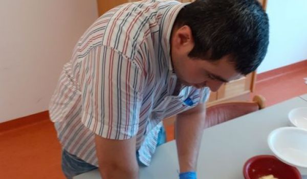 Gemeinsam wurde der Kuchenteig in Handumdrehen zubereitet. Das Warten auf den Kuchen war sehr lang, denn es roch schon sehr lecker aus dem Ofen. Endlich fertig genossen die Klient*innen den selbstgemachten Cheesecake und feierten den Geburtstag unserer Klientin.
