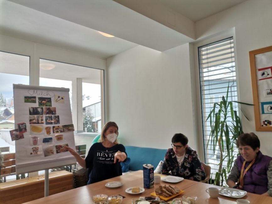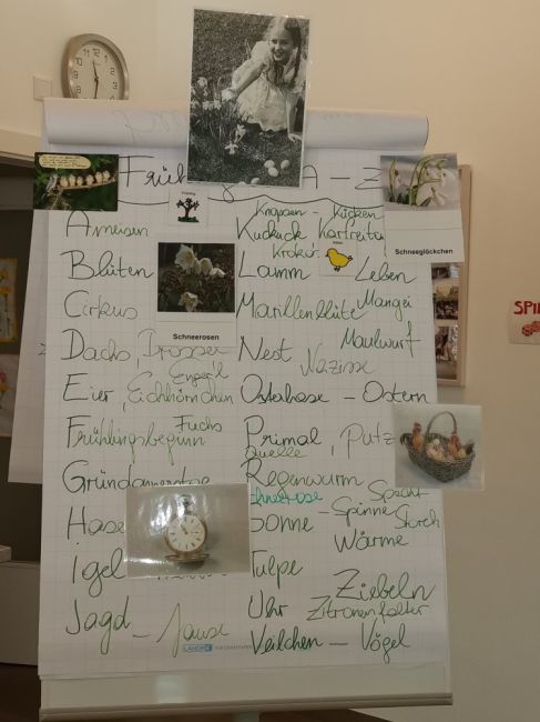 Den Klient*innen wurde bei einer Gedächtnis- und Gebärdensprache-Einheit der Frühling nähergebracht. Materialien dazu waren Ostereier, Palmkätzchen, Bilder zum Frühling und eine Akustikbox mit Vogelgezwitscher. Es wurden Lieder gesungen, Bilder angeschaut, Geschichten von früher erzählt und Frühlingsbegriffe von A-Z gesammelt. Danach ließen wir den Tag mit einem Frühlingsspaziergang und anschließendem Kaffeehausbesuch ausgeklingen.