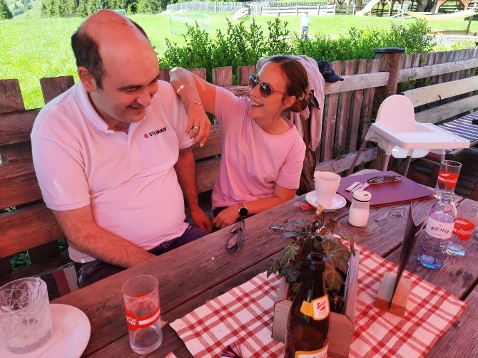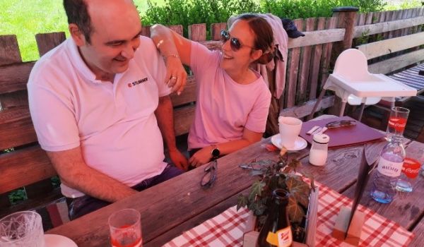 Auf der Sonnenterrasse hoch oben am Berg genossen sie die Sonnenstrahlen bei einem kühlen Getränk und einem Eis.