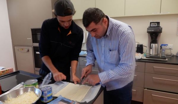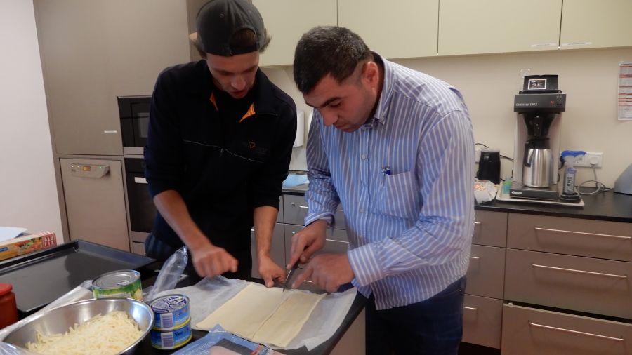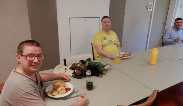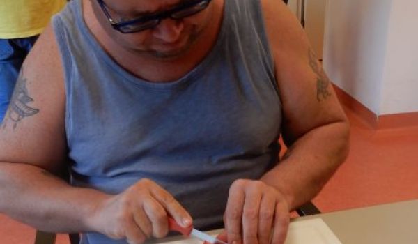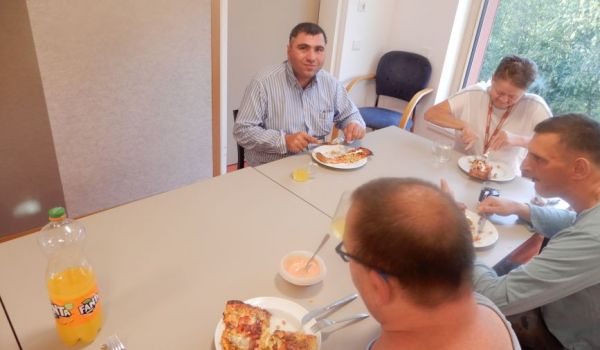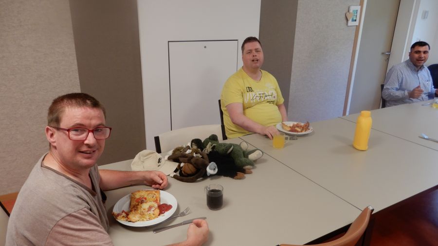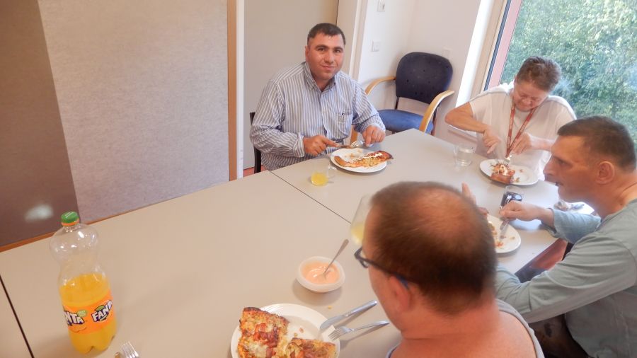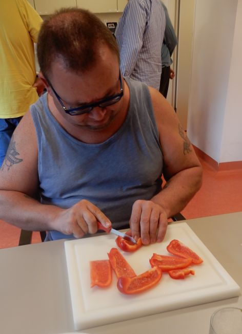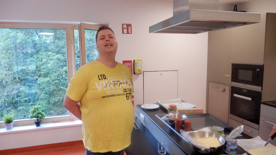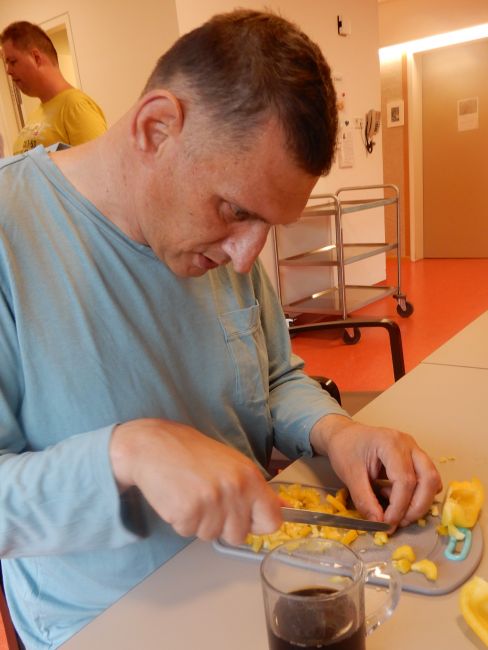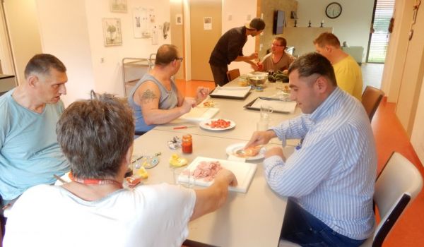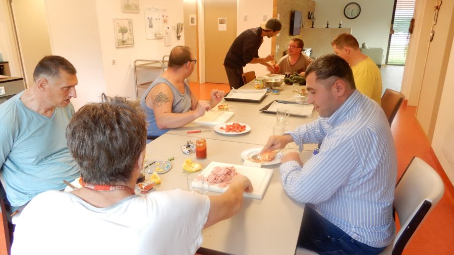 Die Klient*innen waren mit vollem Eifer bei der Arbeit und bereiteten die Zutaten für die köstliche Pizza gemeinsam vor. Jeder durfte sein Stück Pizza selbst gestalten und nach seinem Geschmack belegen. Dann wurde schön geschlemmt und der Abend mit einem süßen Dessert abgerundet.