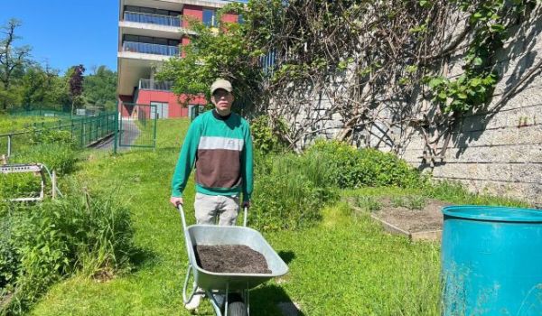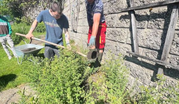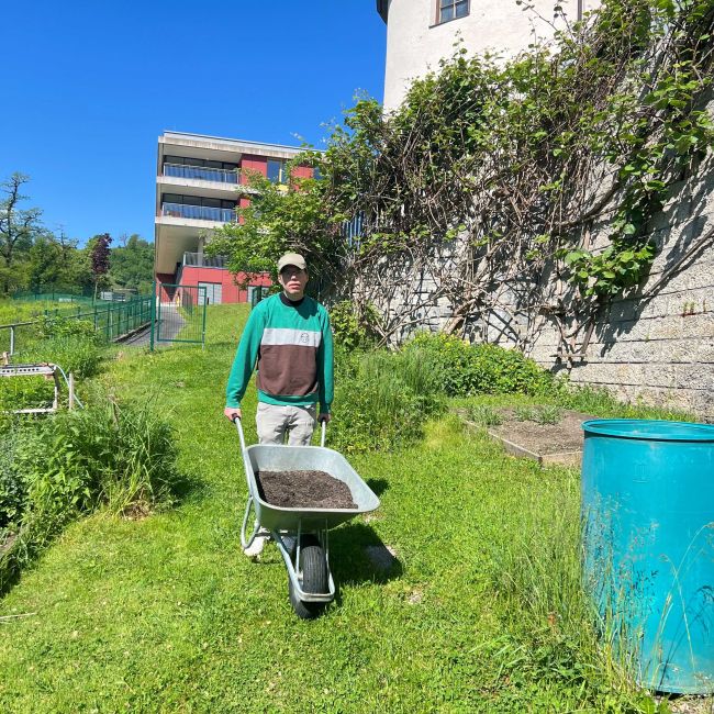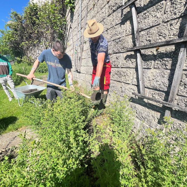 Sarah, Martin, Florian, Hans-Peter und Michi von der Kräuterwerkstatt, sähen, pflanzen und ernten bei wunderschönem Wetter die Kräuter aus dem eigenem Schloss-Kräutergarten.